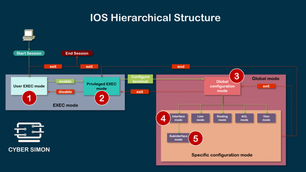 Cisco IOS 给我们提供了一个层次化的CLI(Command-Line Interface)配置结构。为了帮助我们清晰的配置 Cisco 设备,Cisco IOS 命令行界面分为不同的命令模式。每种命令模式都有自己的一组命令,可用于配置、维护,监控路由器和网络操作。