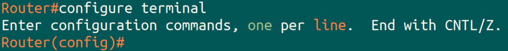 - 在特权执行模式下使用命令configure terminal可以跳转到特权执行模式,如 Router#configure terminal