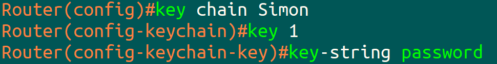 - 如下图,配置密钥链的过程就是先进入key chain的指定模式,然后进入key 1的子模式的过程