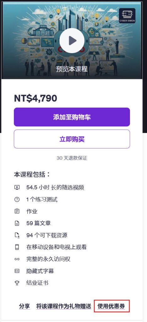• 直接点击优惠链接,便可直达对应课程的优惠价购买页面(您可以先登录 Udemy 账户然后再点击优惠链接);