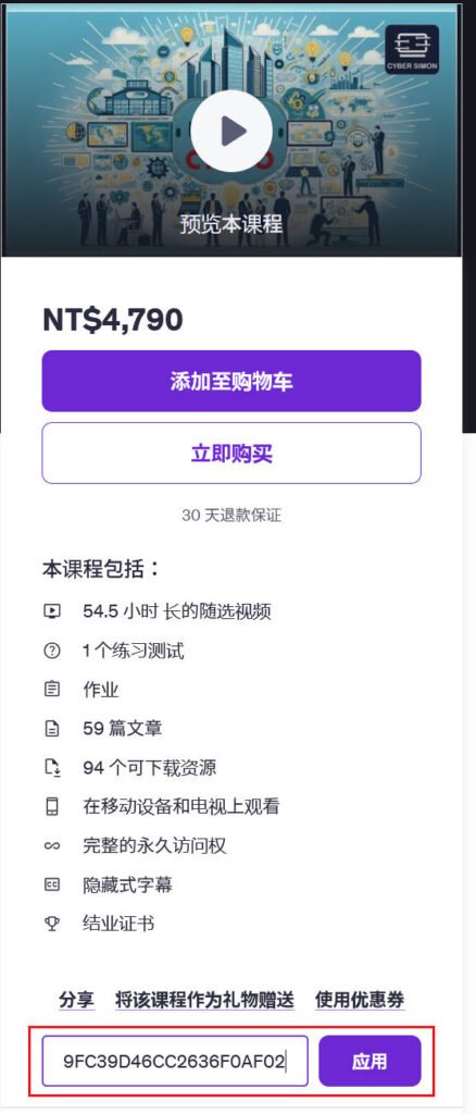 • 最佳解决方法是我们手动输入优惠码,比如我们将优惠链接中 https://www.udemy.com/course/ccna-all-in-one/?couponCode=9FC39D46CC2636F0AF02 最后面的代码(“=”后面的内容就是优惠码),这个例子中就是 9FC39D46CC2636F0AF02 部分复制后手动粘贴到优惠链接的对话框中,点击应用就可以了;