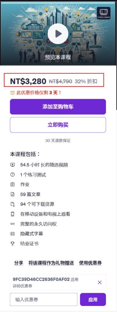 • 我希望为每位学习者降低学习成本、节省学习费用,但受 Udemy 平台政策限制,以下是我可设置的最低优惠价格约 6.5 折,由于汇率等问题,会有极小的浮动);