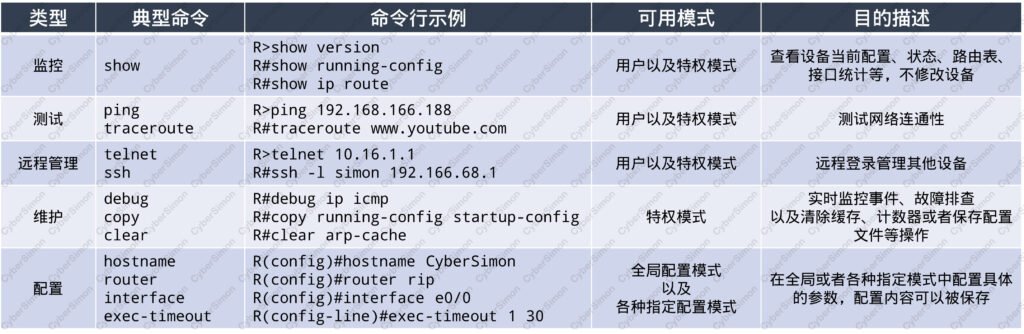 还有其他的类型,我就不一一列举了在上面的信息中我们可以看到,Cisco对不同模式下的命令都做了分类,每一类都执行特定的用途。